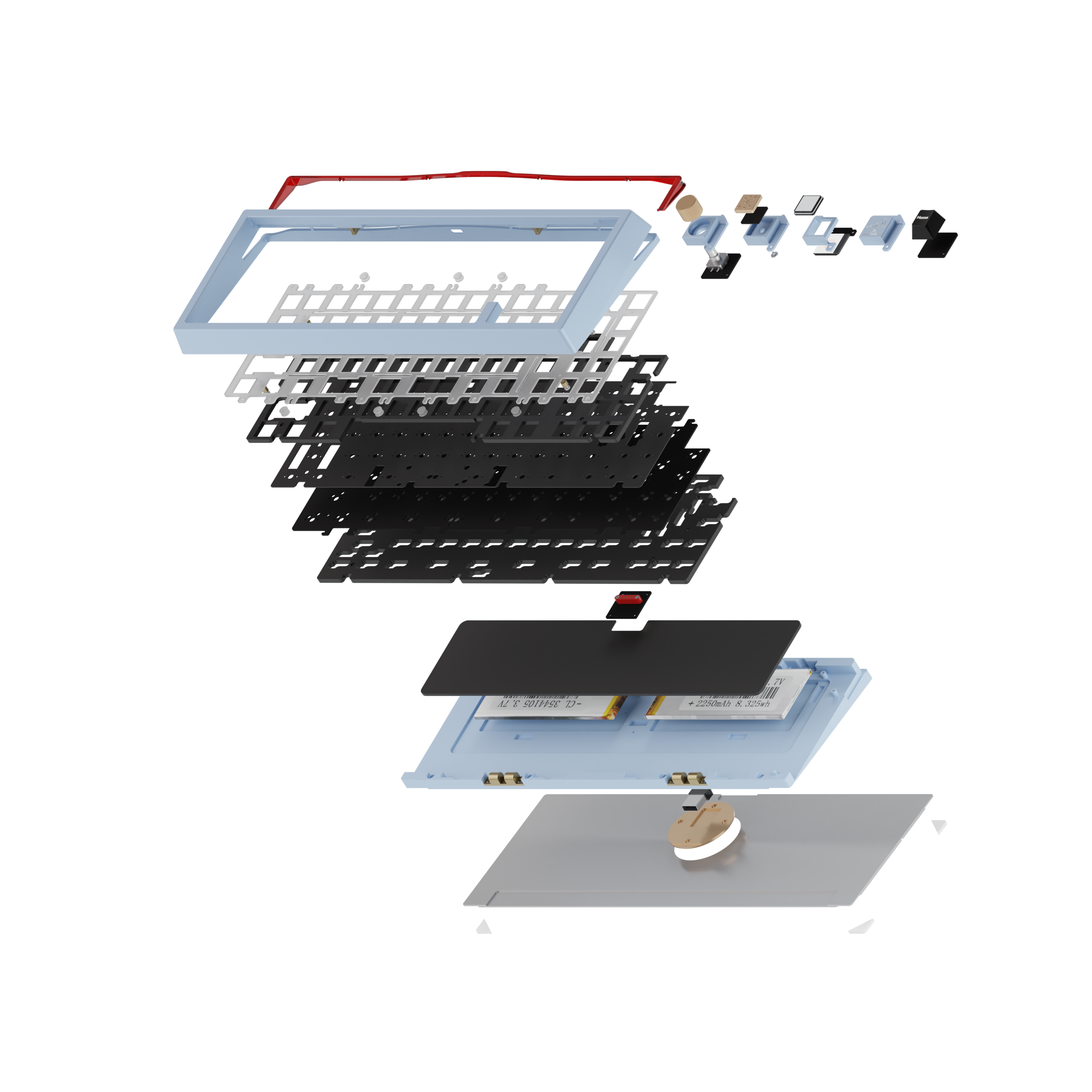 We have created a system by splitting the rubber rings into separate parts and using extended blockers to support the O-rings, ensuring that even when the keyboard is flipped, the PCB and O-rings will not come loose. Additionally, our innovation will allow you to use any stabilizer, eliminating the traditional system's restrictions on the backspace position.