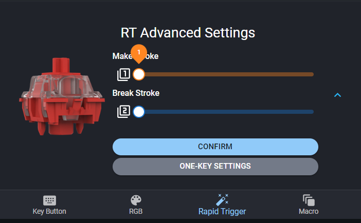 Adjustable activation point for each key from 0.1 mm - 4.0 mm with an accuracy of 0.1 mm