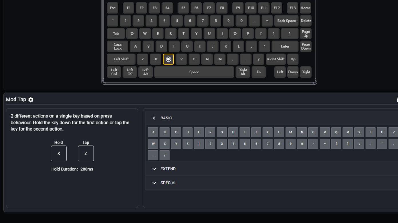 2 different actions on a single key based on press behaviour. Hold the key downfor the first action or tap the key for the second action. Mod tap function improves operational and input efficiency by providing additional shortcuts.