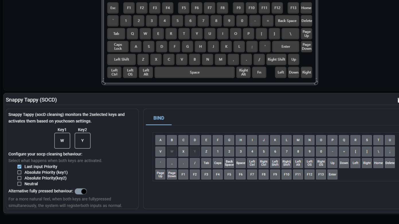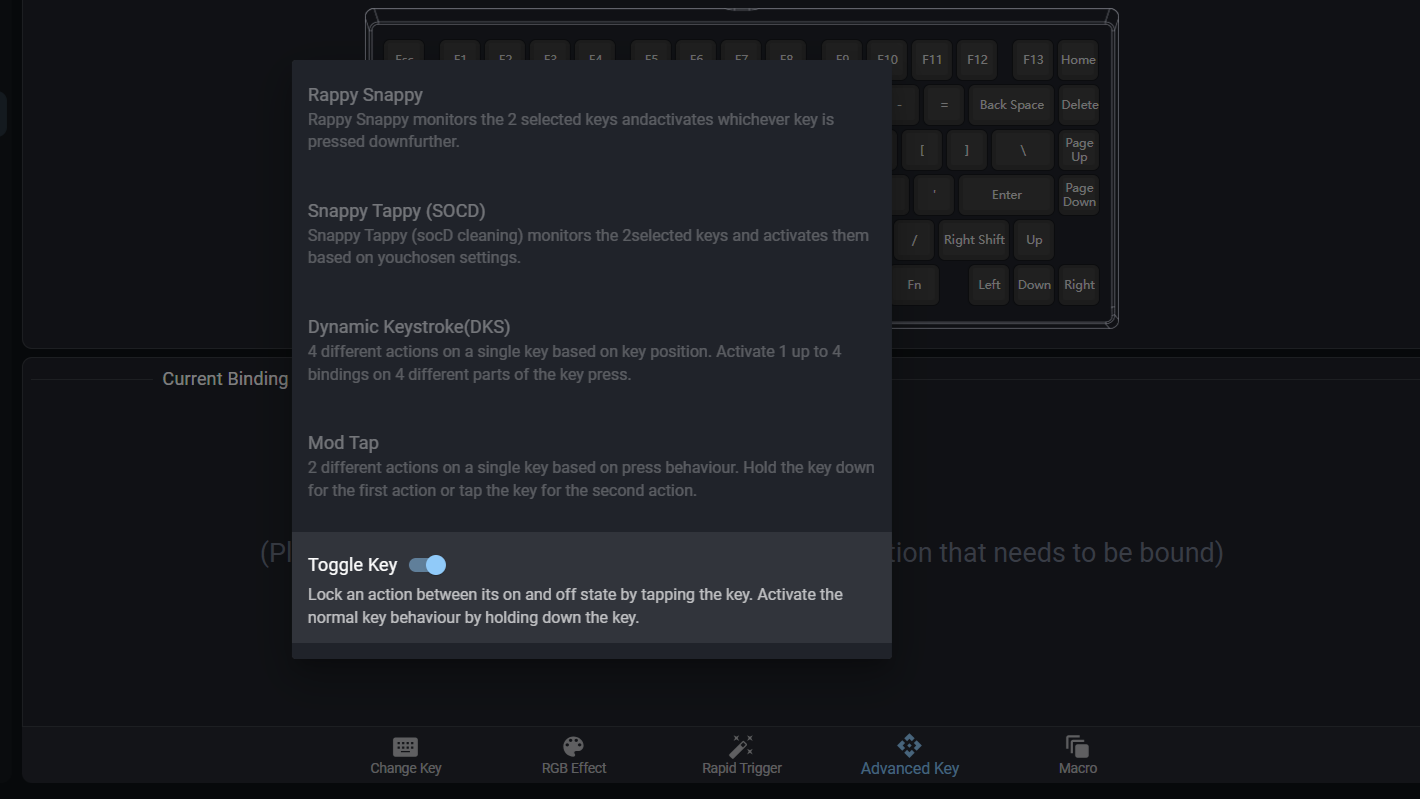 4 different actions on a single key based on key position. Activate 1 up to 4bindings on 4 different parts of the key press.The key response distance can be adjusted as needed to provide greater flexibility and customisation.
