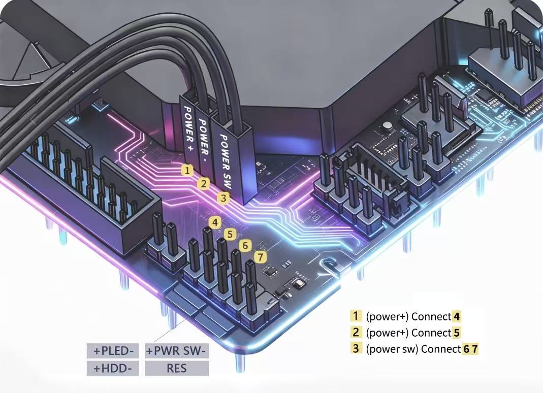 Connect the wires to the corresponding pins on the motherboard according to the diagram. If you wish to retain the functionality of the original power button, you will need to purchase a 1-to-2 splitter cable separately.