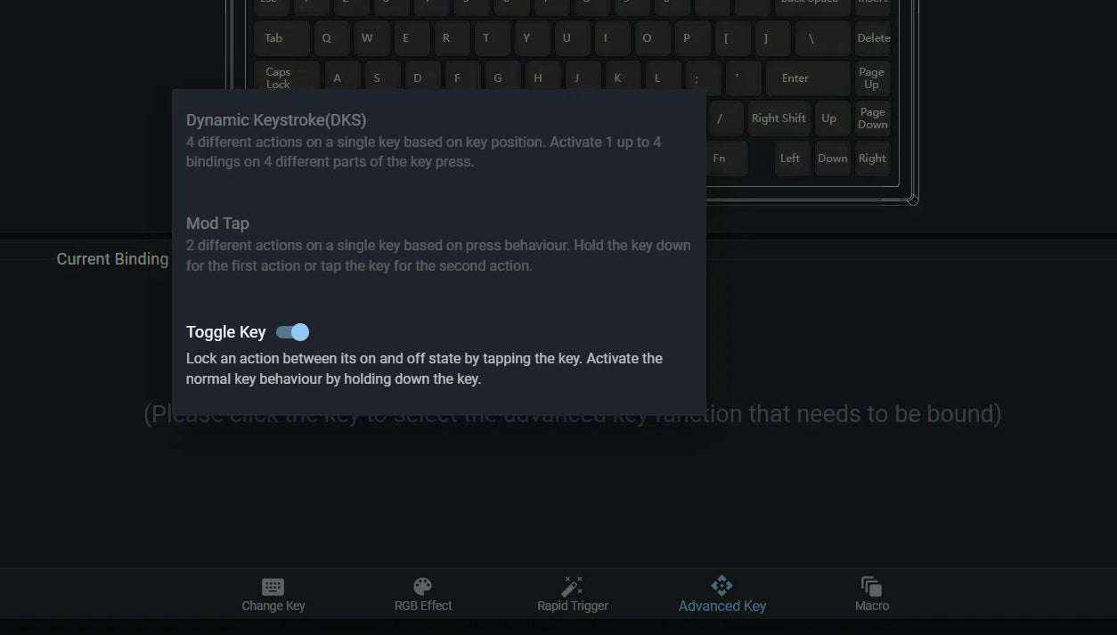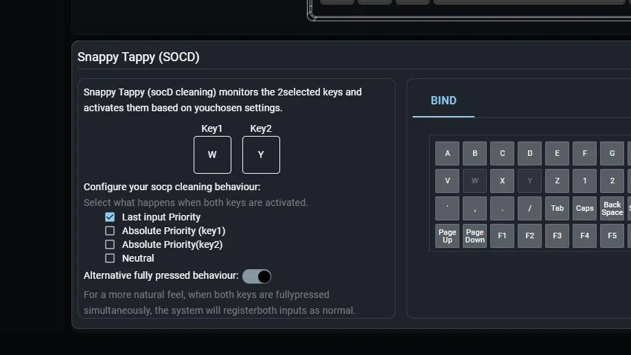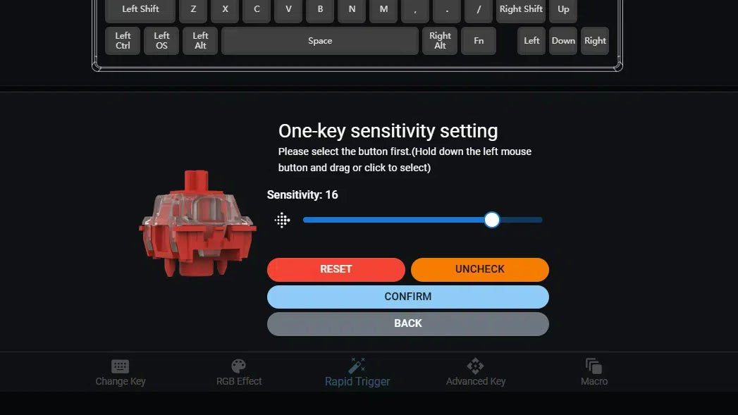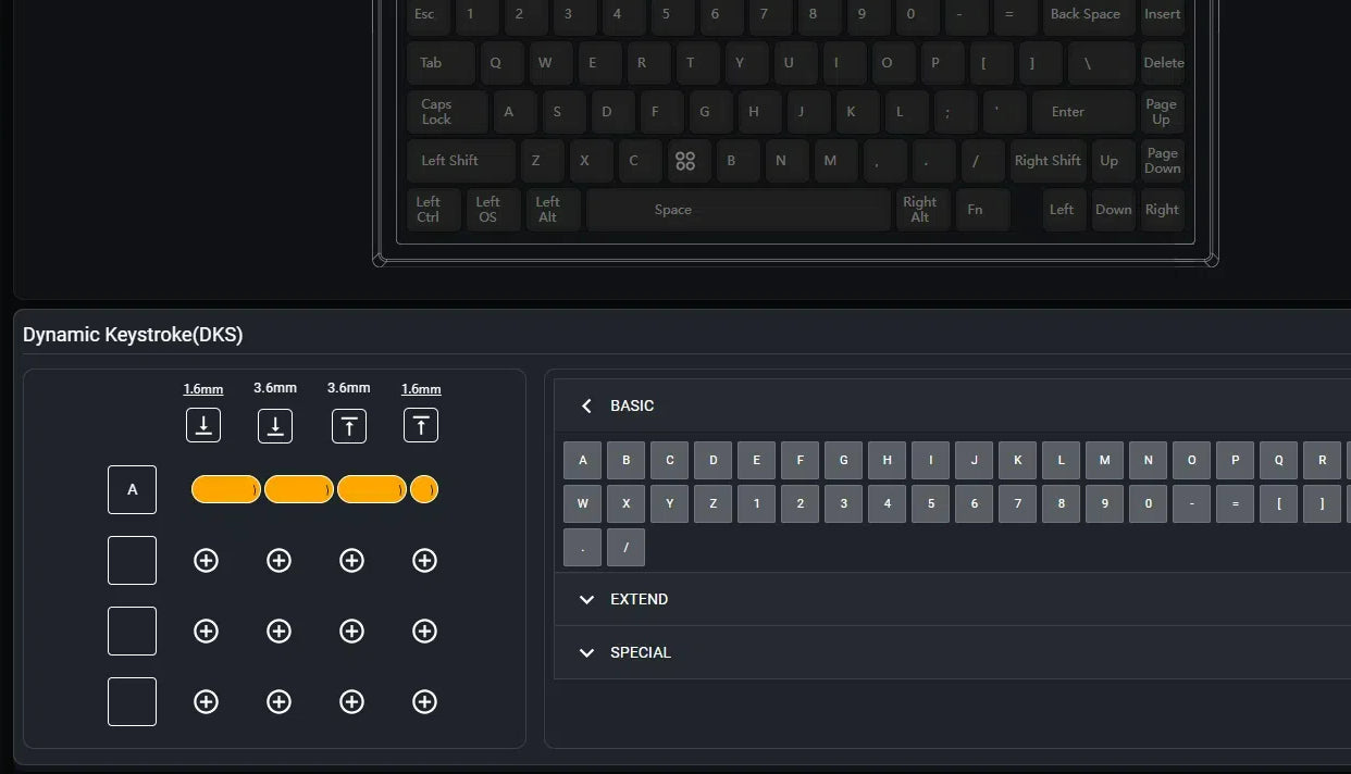 4 different actions on a single key based on key position. Activate 1 up to 4bindings on 4 different parts of the key press.The key response distance can be adjusted as needed to provide greater flexibility and customisation.