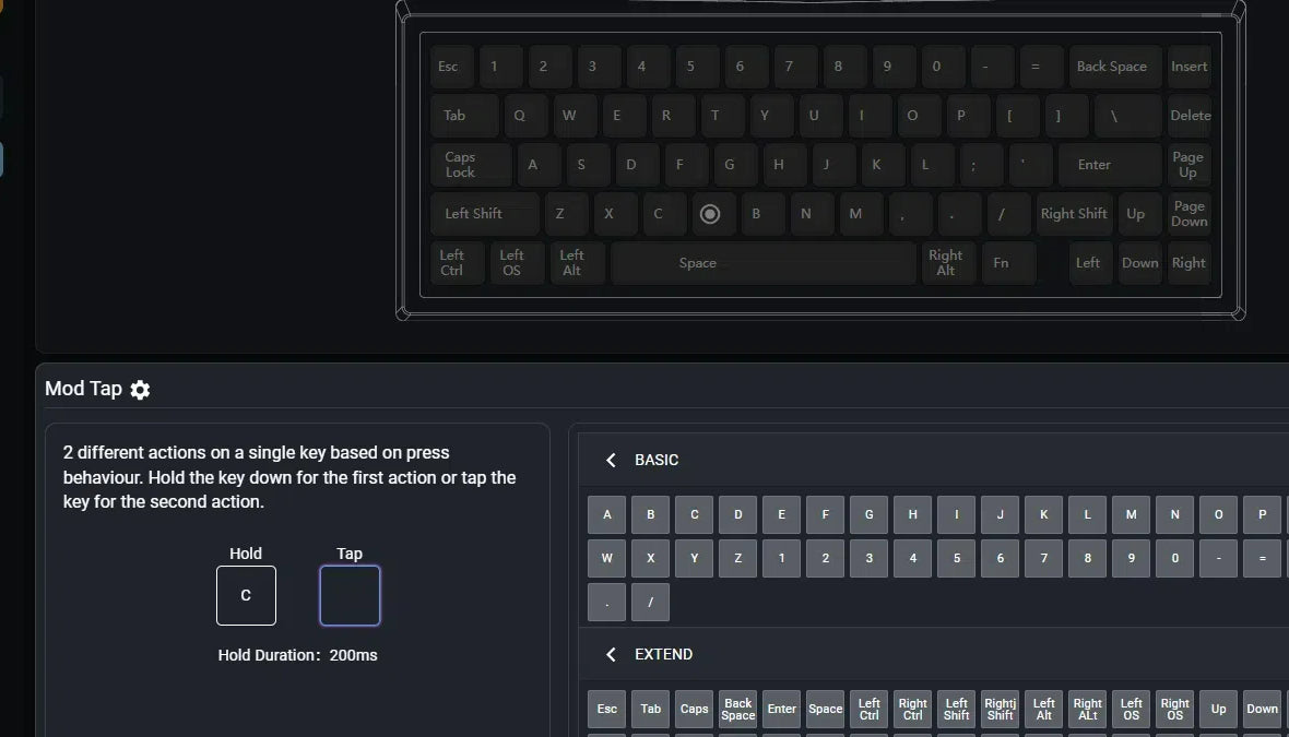 2 different actions on a single key based on press behaviour. Hold the key downfor the first action or tap the key for the second action. Mod tap function improves operational and input efficiency by providing additional shortcuts.